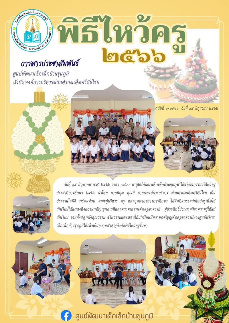 รายละเอียด : ศพด.บ้านปานเจริญและศพด.บ้านขุนภูมิ ได้จัดกิจกรรมวันไหว้ครู ประจำปีการศึกษา 2566 นำโดย นายนิกุล คุณมี นายกองค์การบริหารส่วนตำบลเดื่อศรีคันไชย ประธานในพิธี พร้อมด้วยคณะผู้บริหาร ครู และบุคลากรทางการศึกษา