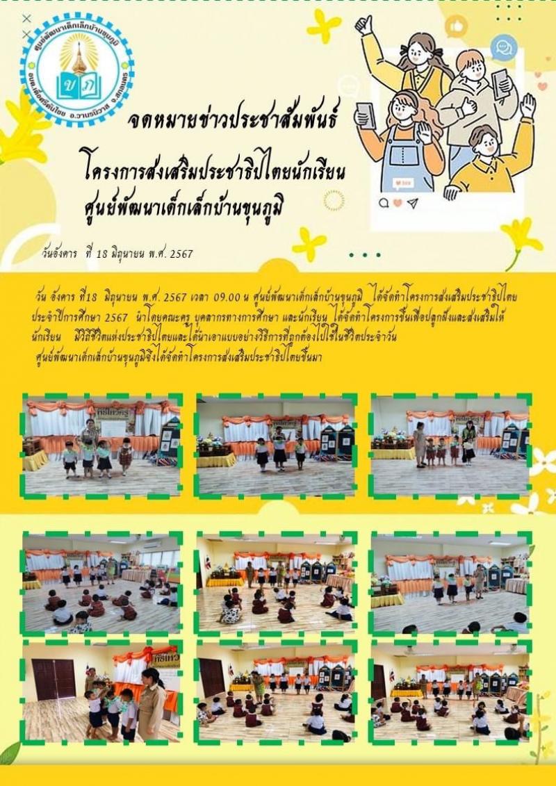 ศูนย์พัฒนาเด็กเล็กบ้านขุนภูมิ จัดทำโครงการส่งเสริมประชาธิปไตย และจัดทำโครงการขึ้นเพื่อปลูกฝังและส่งเสริมให้นักเรียน มีวิถีชีวิตแห่งประชาธิปไตยและได้นำเอาแบบอย่างวิธีการที่ถูกต้องไปใช้ในชีวิตประจำวัน