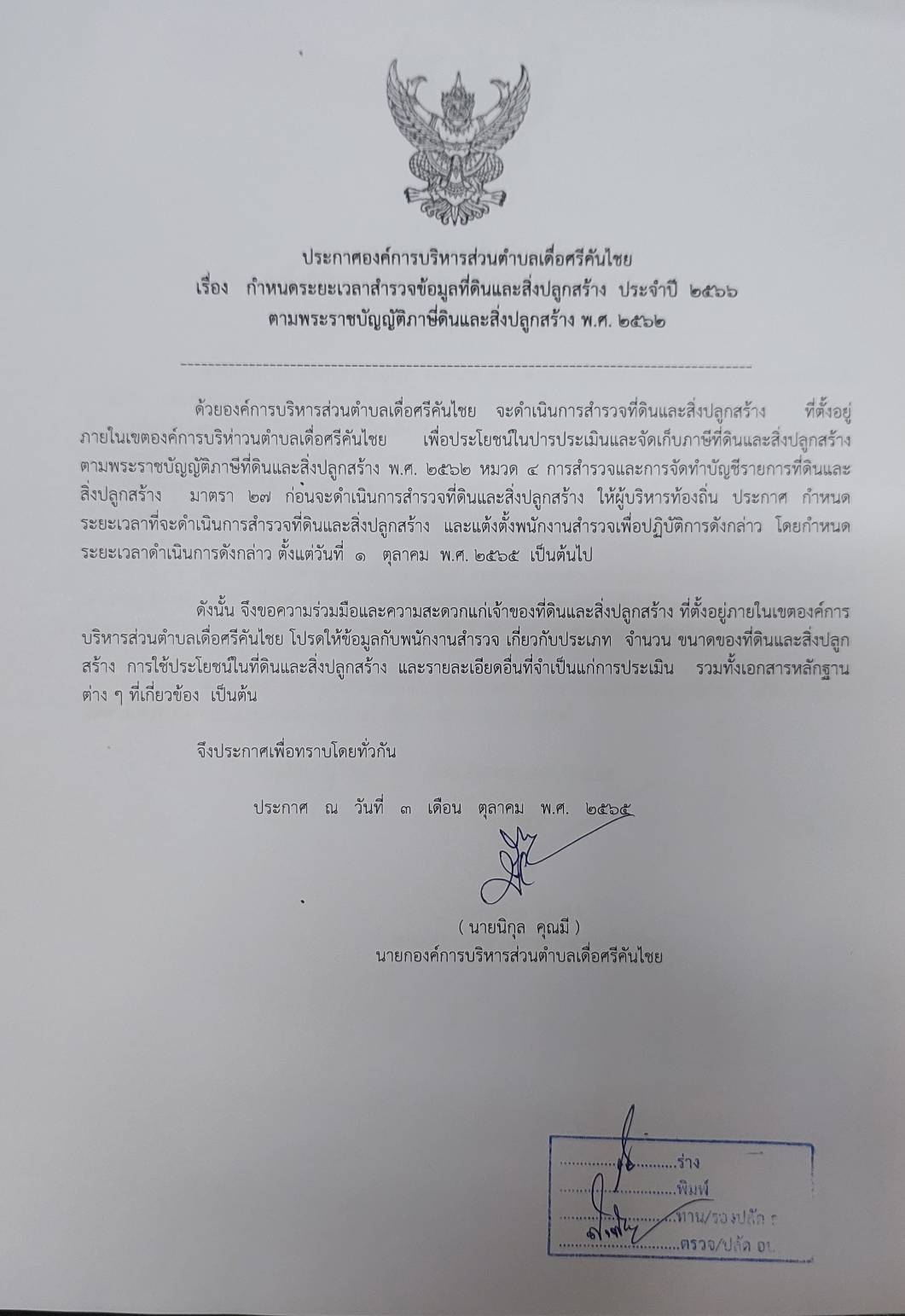 ประกาศองค์การบริหารส่วนตำบลเดื่อศรีคันไชย เรื่อง กำหนดระยะเวลาสำรวจข้อมูลที่ดินและสิ่งปลูกสร้าง ประจำปี 2566