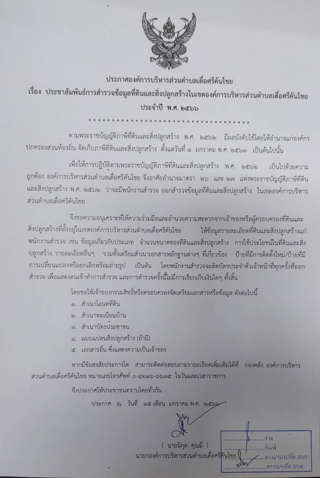 ประกาศองค์การบริหารส่วนตำบลเดื่อศรีคันไชย เรื่อง ประชาสัมพันธ์การสำรวจข้อมูลที่ดินและสิ่งปลูกสร้าง ในเขตองค์การบริหารส่วนตำบลเดื่อศรีคันไชย ประจำปี พ