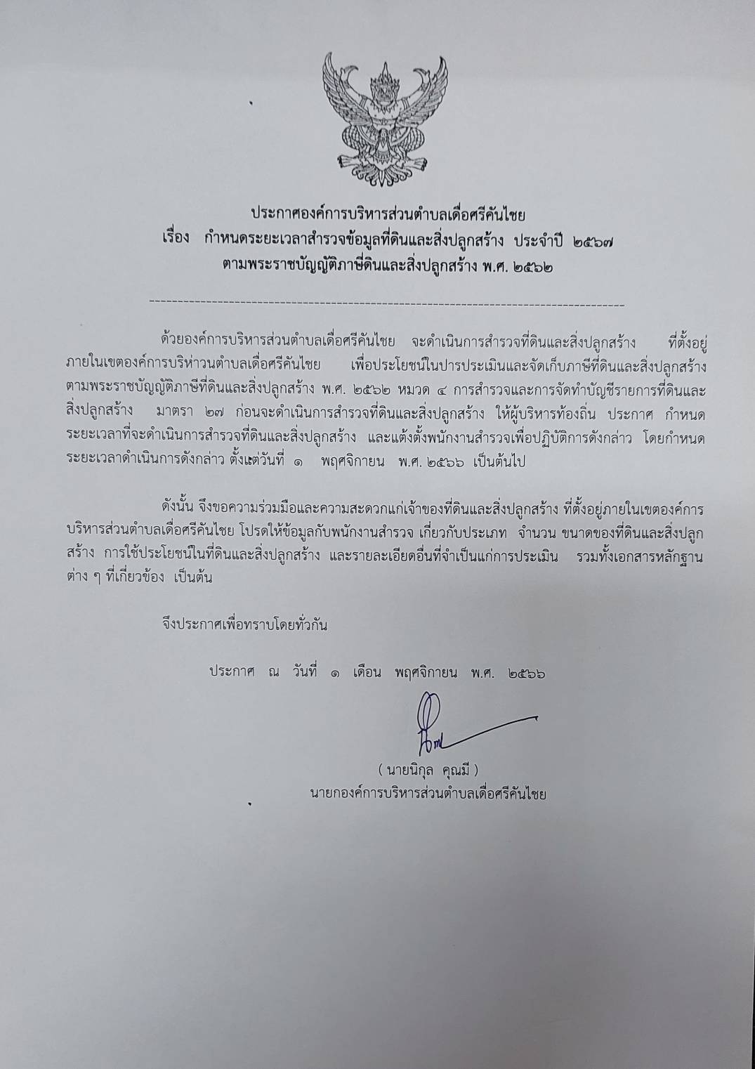 ประกาศองค์การบริหารส่วนตำบลเดื่อศรีคันไชย เรื่อง กำหนดระยะเวลาสำรวจข้อมูลที่ดินและสิ่งปลูกสร้าง ประจำปี 2567