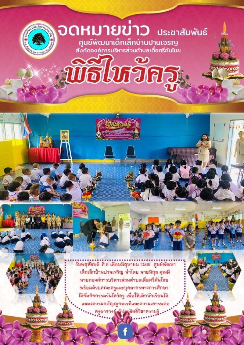 รายละเอียด : ศพด.บ้านปานเจริญและศพด.บ้านขุนภูมิ ได้จัดกิจกรรมวันไหว้ครู ประจำปีการศึกษา 2566 นำโดย นายนิกุล คุณมี นายกองค์การบริหารส่วนตำบลเดื่อศรีคันไชย ประธานในพิธี พร้อมด้วยคณะผู้บริหาร ครู และบุคลากรทางการศึกษา
